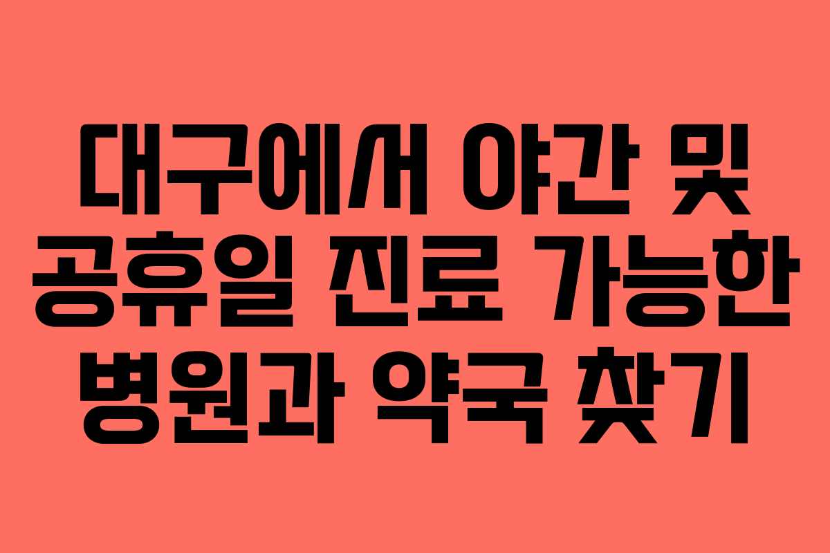 공휴일에는 많은 병원과 약국이 운영하지 않지만, 가까운 공휴일에 대해 진료 정보를 체크하여 필요한 경우 방문할 수 있습니다. 대구의 주요 공휴일에 대한 진료 정보는 아래와 같습니다: