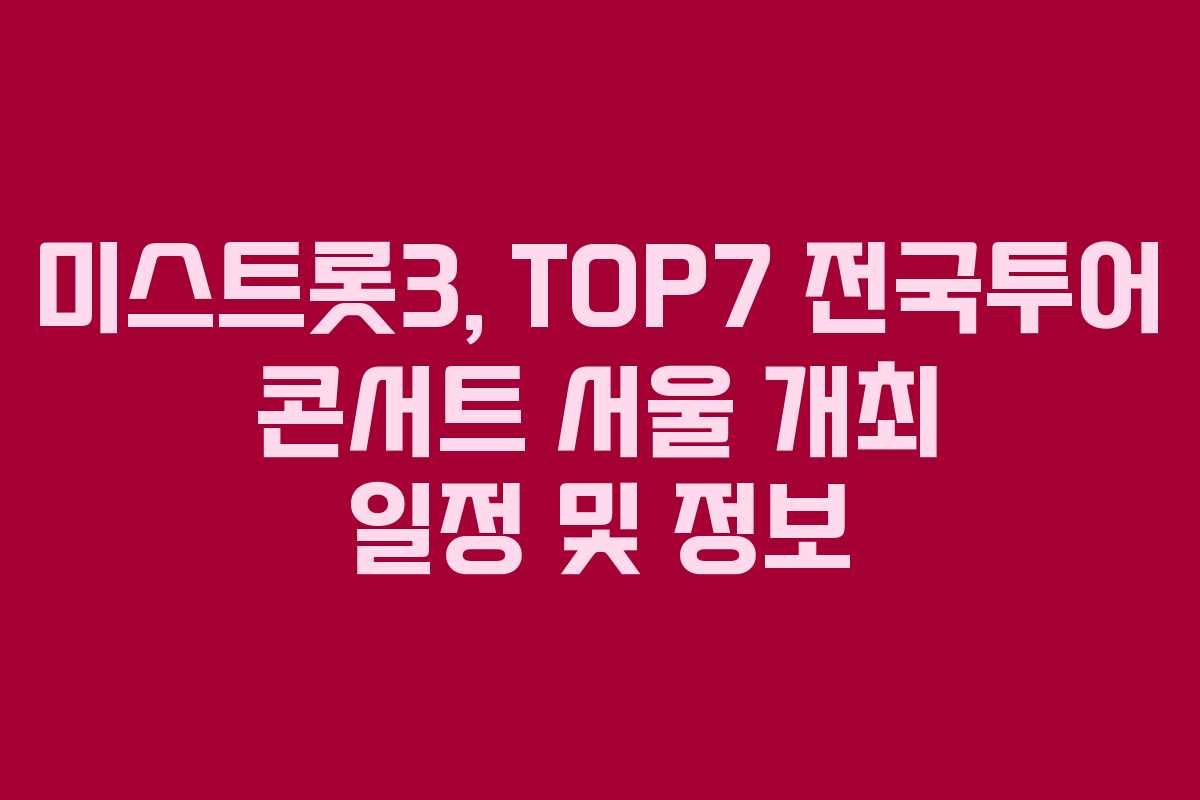 2024년 ‘미스트롯 3, TOP7 전국투어 콘서트’가 서울에서 개최됩니다. 이 콘서트는 트로트 오디션 프로그램 ‘미스트롯 3’의 인기 출연진들이 함께하는 특별한 행사로, 많은 팬들의 기대를 모으고 있습니다.