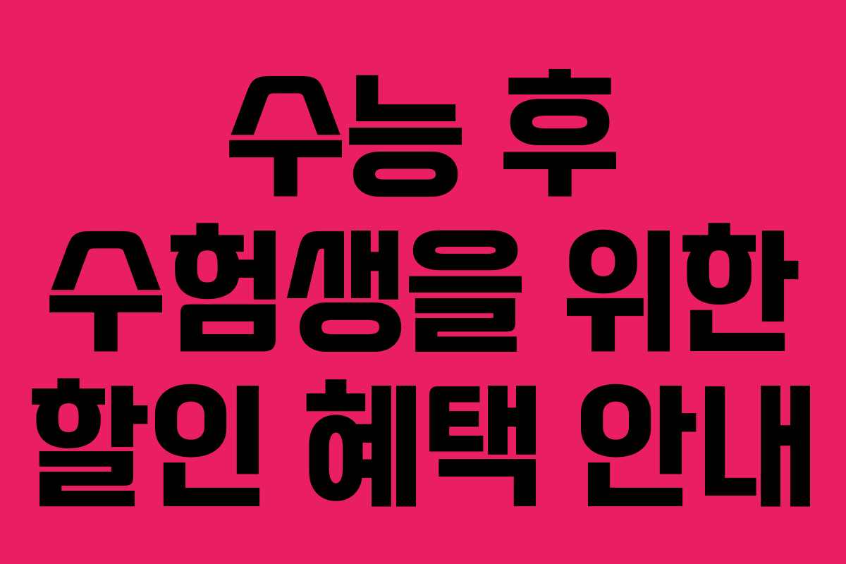 수능을 마친 수험생 여러분에게 다양한 할인 혜택이 제공됩니다. 수험표만 있으면 여러 업체에서 할인받을 수 있는 기회를 활용해보세요. 이번 기회를 통해 소중한 혜택을 놓치지 않으시길 바랍니다.