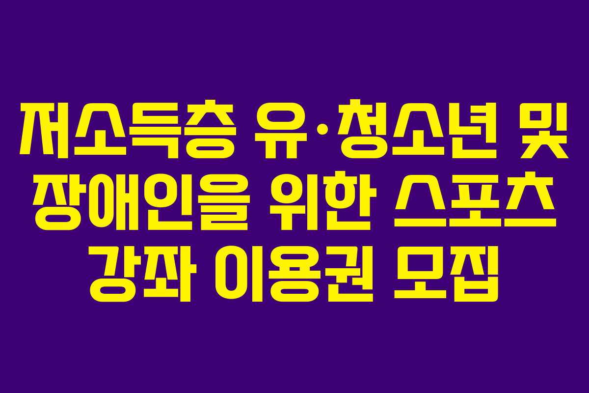 2024년도 저소득층 유·청소년 및 장애인을 대상으로 하는 스포츠 강좌 이용권 신청이 11월 8일부터 30일까지 진행됩니다. 이를 통해 스포츠 활동 참여기회를 확대하고 건강 증진을 도모하고자 합니다.