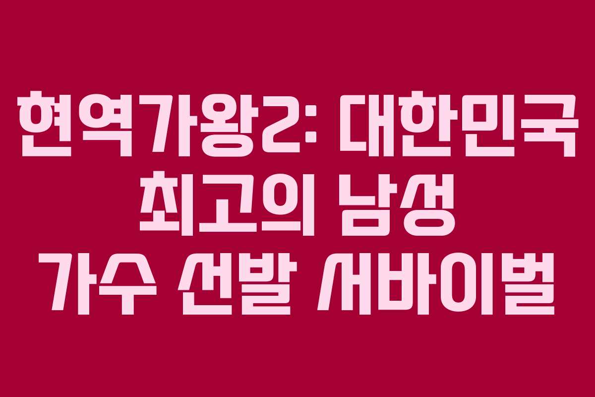 현역가왕2는 한일 수교 60주년을 기념하여 대한민국을 대표하는 최정상급 남성 가수를 선발하는 서바이벌 예능 프로그램입니다. 2025년에 개최될 ‘한일가왕전’을 위한 TOP7을 선발하는 이 프로그램은 매주 화요일 오후 9시 40분에 MBN에서 방송됩니다.